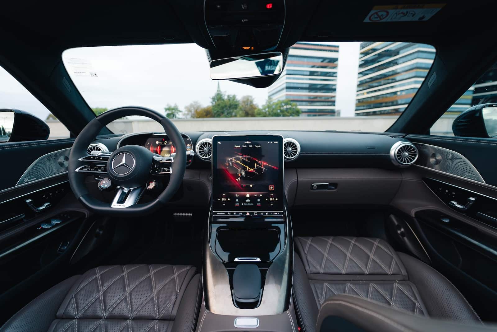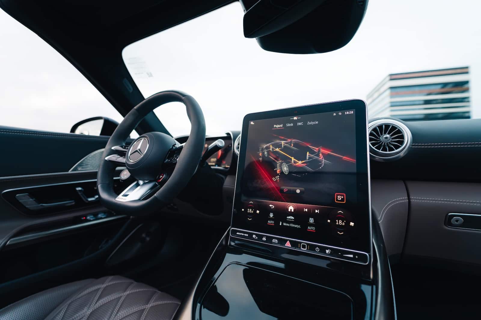 Wnętrze SL 63 AMG to mistrzowskie połączenie sportowego charakteru z luksusem. Najwyższej jakości materiały, sportowe fotele, zaawansowany system multimedialny i cyfrowe zegary tworzą kokpit na miarę XXI wieku. Każdy detal został zaprojektowany z myślą o komforcie i intuicyjnej obsłudze, abyś mógł skupić się wyłącznie na przyjemności z jazdy.